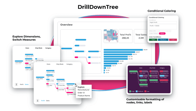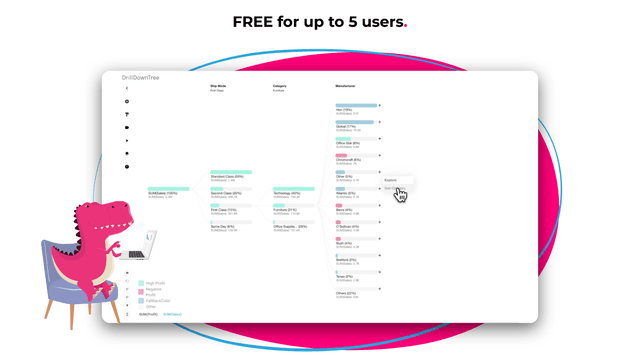 DrillDownTree allows you to drill down on any measure to any dimension you wish. The extension offers a flexible DrillDownTree for dashboard users. It will let you visualize data across multiple dimensions without setting up hierarchies upfront. Visualize data across multiple dimensions.