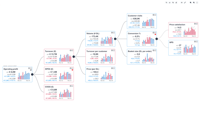 Use PowerKPIs as the new central entry point for your analysis in Tableau. It provides a powerful platform for illustrating the connections between different KPIs in an engaging value driver tree format, adding valuable context to data-driven decisions. From top-level summaries to detailed examinations of specific operational drivers, PowerKPIs enhances your ability to tell a compelling story of business performance through a single, intuitive interface.