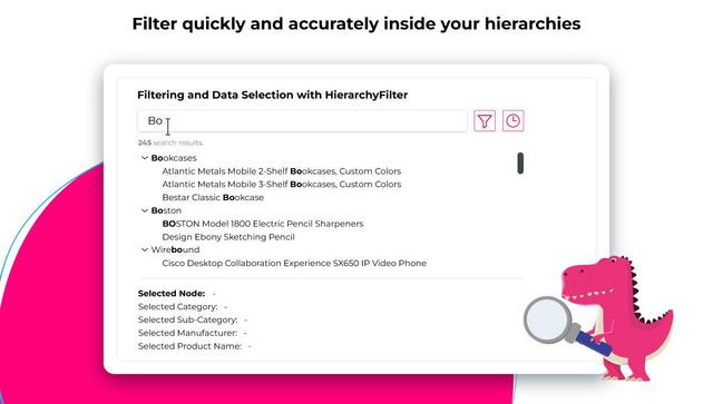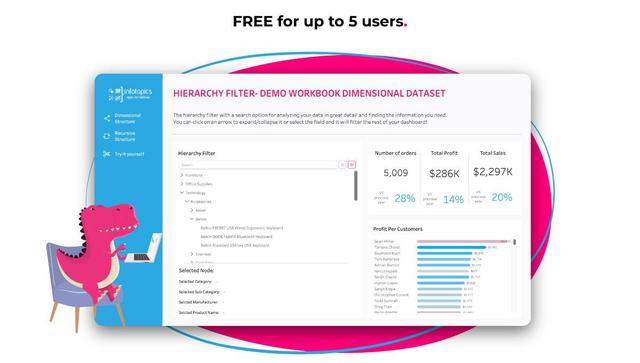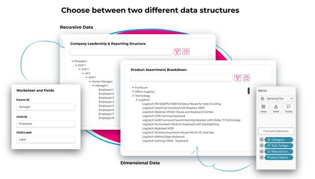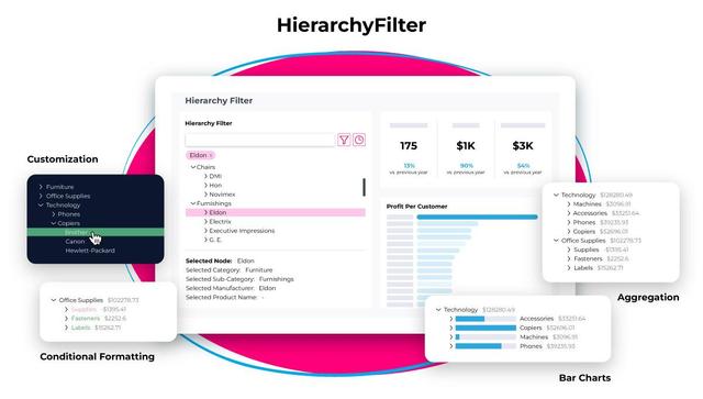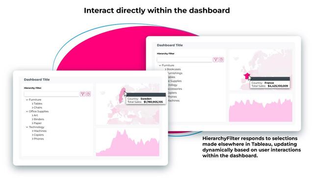 HierarchyFilter levels up traditional hierarchical filtering into a fast, intuitive, and visual component for Tableau dashboards. HierarchyFilter visualizes flat or recursive data structures in a single interactive hierarchy. Replace multiple dashboard filters with one intuitive hierarchy filter and explore data while maintaining full dashboard context.